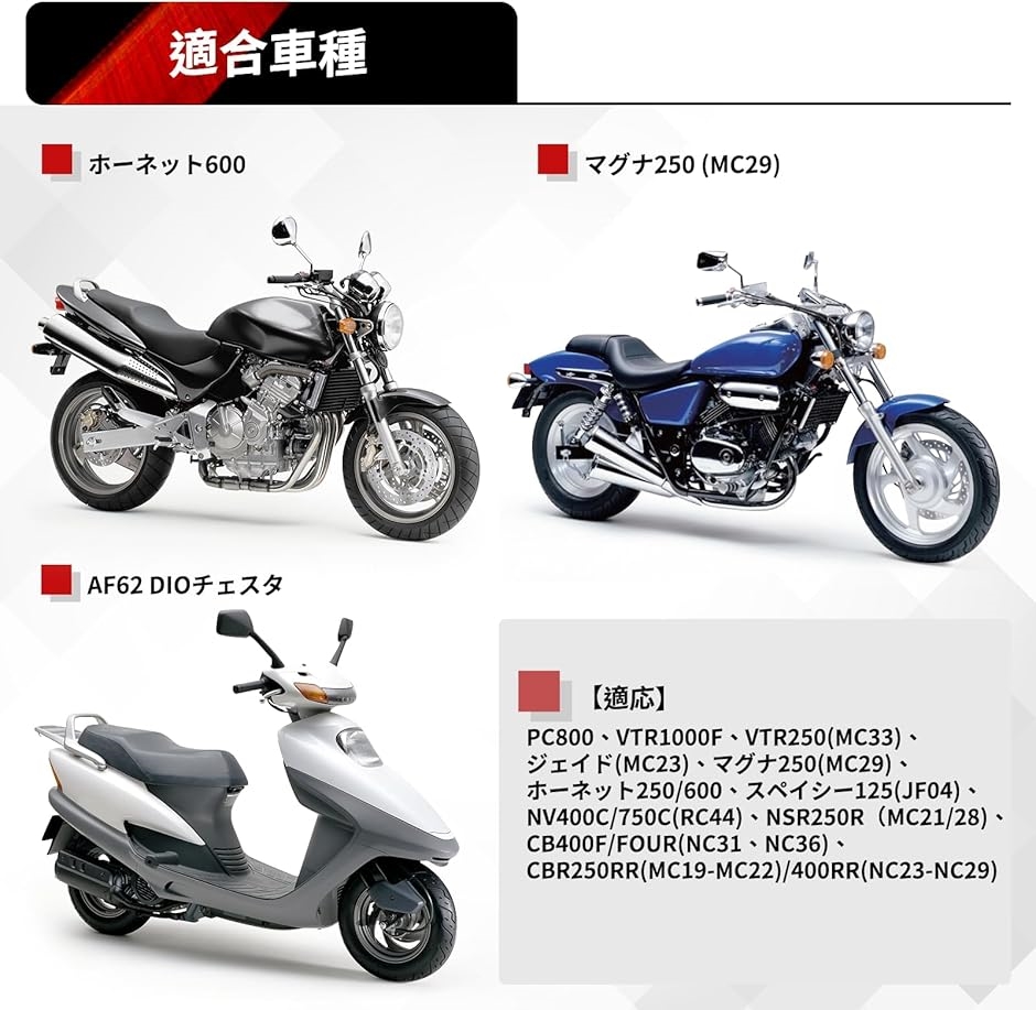 「対応」NSR250R(MC21/28)、CBR250RR(MC19-MC22)/400RR(NC23-NC29)、ホーネット250/600、CB400F/FOUR(NC31、NC36)、VTR250(MC33)、マグナ250(MC29)、PC800、NV400C/750C(RC44)、VTR1000F、ジェイド(MC23)、スペイシー125(JF04)
