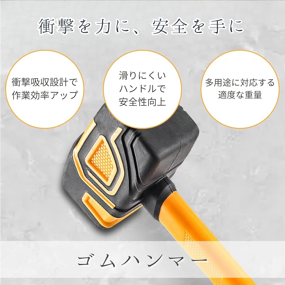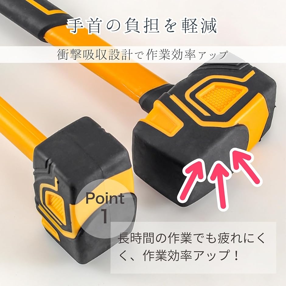「衝撃吸収設計で作業効率アップ」内部にPVC素材を使用し、外側を高品質のゴムで覆った構造により、打撃時の反発を抑制。