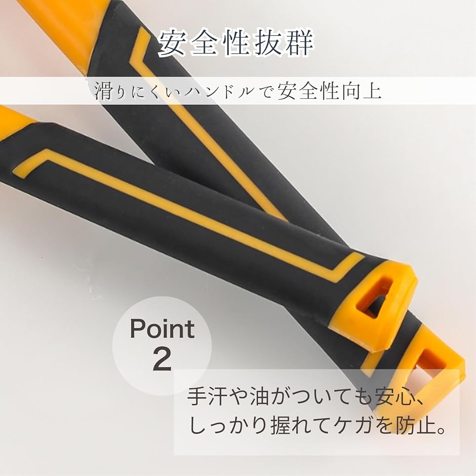「滑りにくいハンドルで安全性向上」ハンドルには滑り止め加工が施されており、汗をかいても握りやすく、作業中の安全性を確保。