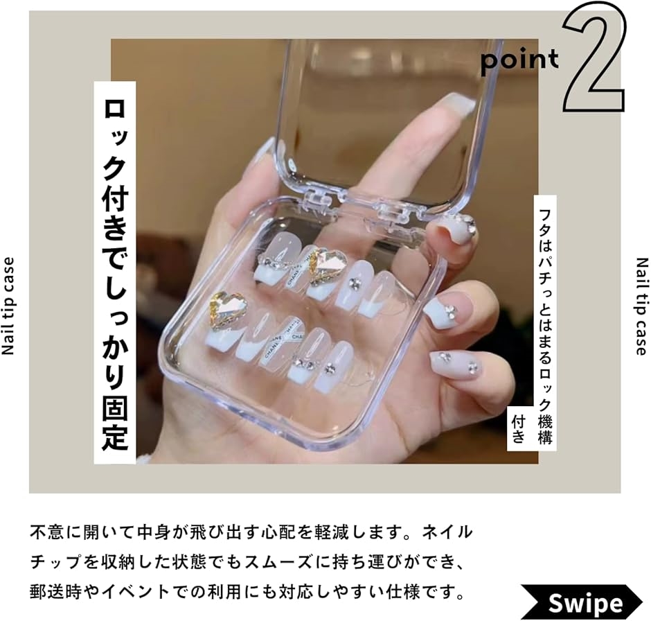 ネイルチップを収納した状態でもスムーズに持ち運びができ、郵送時やイベントでの利用にも対応しやすい仕様です。