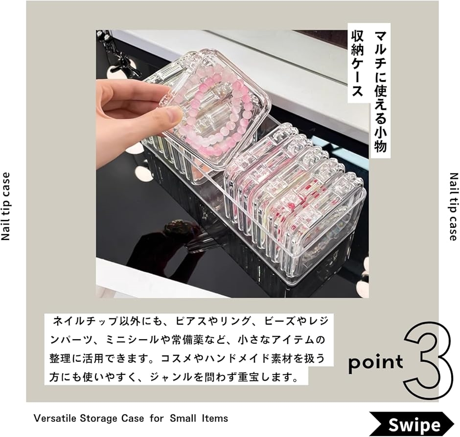 「マルチに使える小物収納ケース」 ネイルチップ以外にも、ピアスやリング、ビーズやレジンパーツ、ミニシールや常備薬など、小さなアイテムの整理に活用できます。