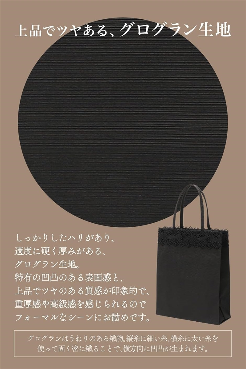 厳かな場にも馴染み、装いに寄り添う控えめリボン、しっかりしたグログラン生地で上品な印象を与えます。