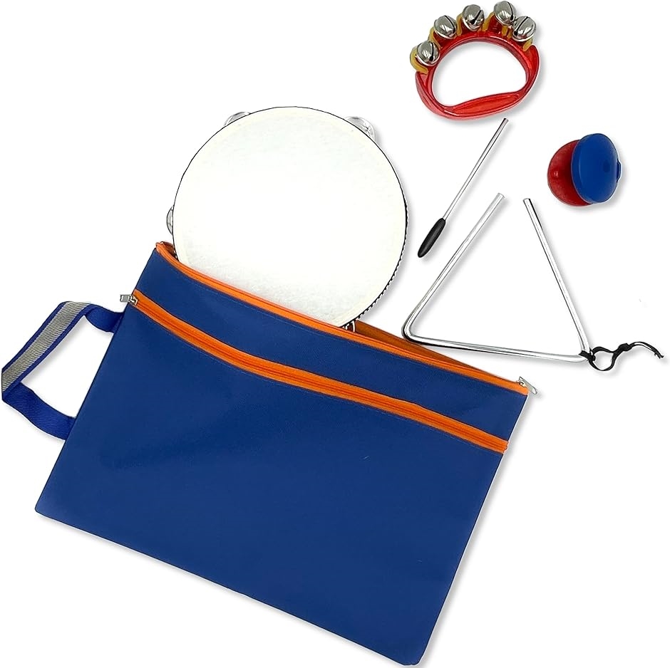 天然のものですのでご了承下さい) トライアングル:高さ14cm、1辺15.5cm バチ 13.8cm x1 カスタネット:直径5.4cm x1 すず:縦 10cm 横8.3cm *カラーは 赤・青いずれかランダムです x1 収納袋:縦34cm 横24.5cm ファスナーポケット付き x1