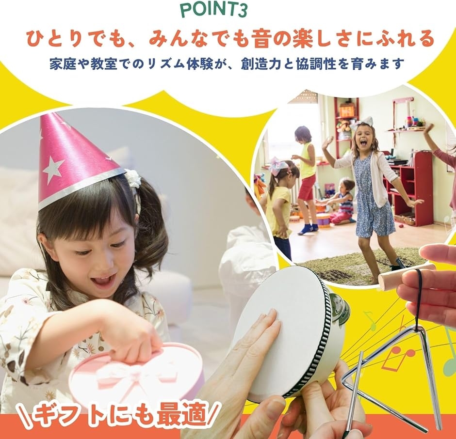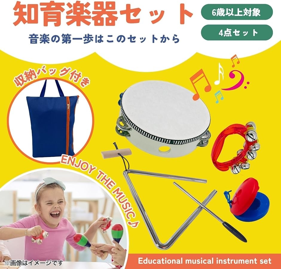 「音楽の基礎を学べる4種の楽器入り」 タンバリン、トライアングル、カスタネット、鈴の4点セットで、多彩な音を体験可能。