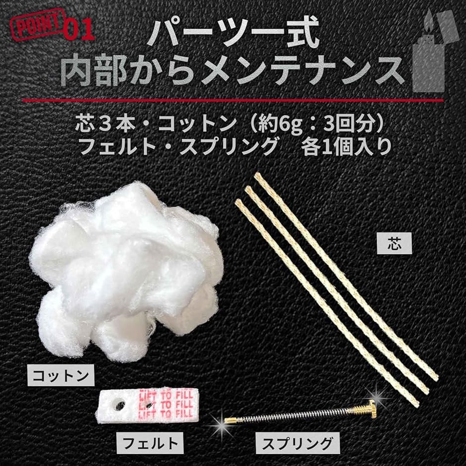 ウィック芯3本、約6.3g(約3回分)のコットン、フェルトパッド、フリントスプリングが揃った、オイルライター用の便利な補修パーツセットです。