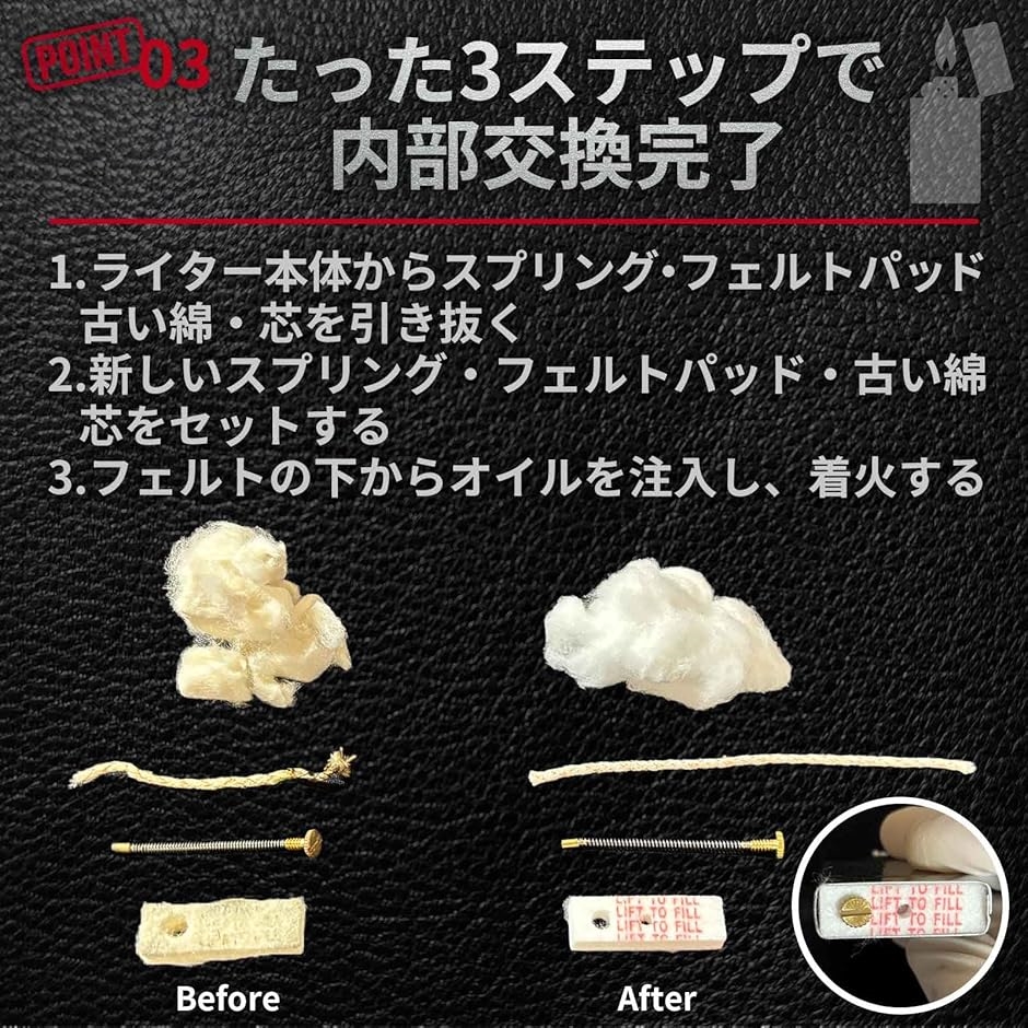 内部パーツを交換するだけで、長年使っているオイルライターを快適に長持ちさせることができます。