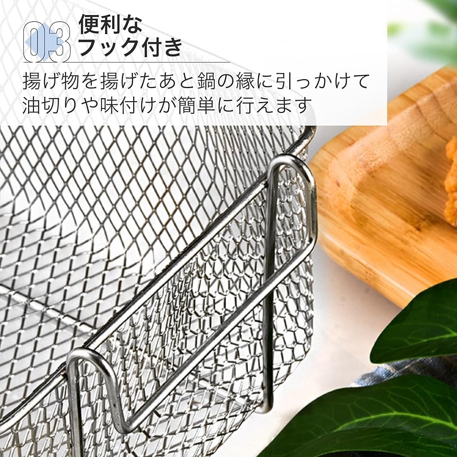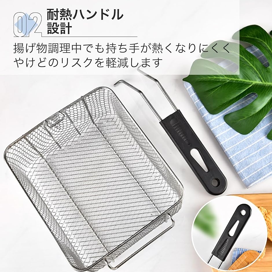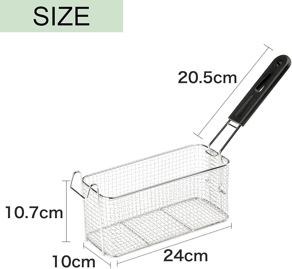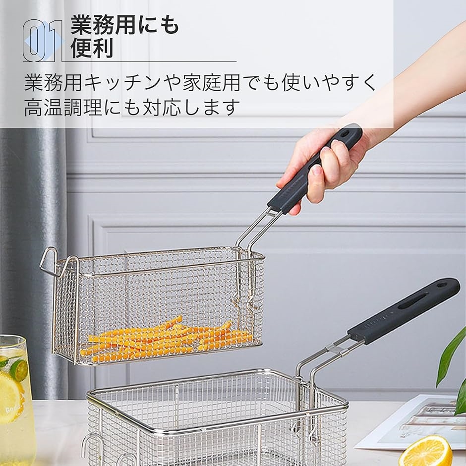「業務用にも便利」 細型フライバスケットとして業務用キッチンや家庭用でも使いやすく、高温調理にも対応します。