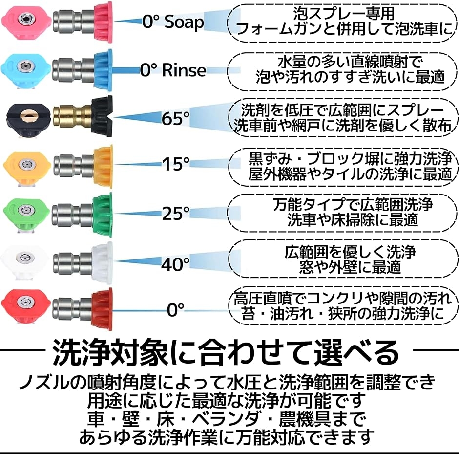 「洗浄対象に合わせて選べる」 0°・15°・25°・40°・65°の5種類のスプレーノズルが付属。