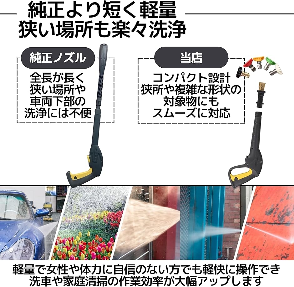 「純正より短く軽量、狭い場所も楽々洗浄」 純正ノズルは全長が長く、狭い場所や車両下部の洗浄には取り回しが不便なことがあります。