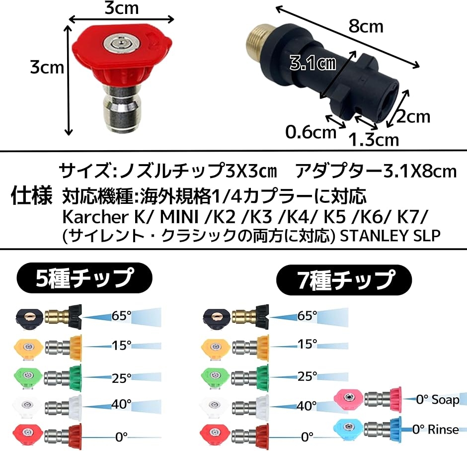 「仕様」 サイズ:ノズルチップ3X3cm、アダプター3.1X8cm セット内容:アダプターX1、5種スプレーチップ(0°, 15°, 25°, 40°, 65°)x各1 対応機種:海外規格1/4カプラーに対応。