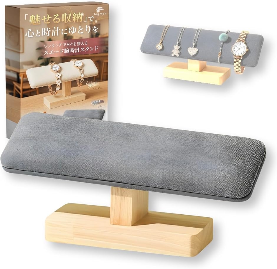 「商品仕様」木製フレーム、スエード調クッション付き台座、最大4本収納可能、サイズ:約20x8x10cm、カラー:ベージュ、グレー