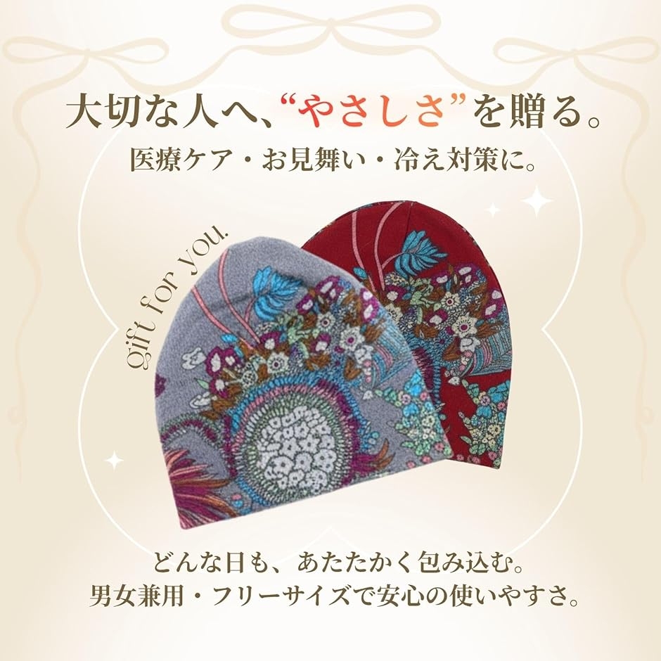 やさしい色合いと花柄デザインが、日々の暮らしに小さな彩りを添えてくれる医療用帽子です。