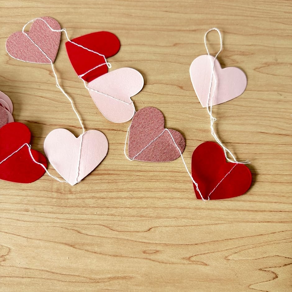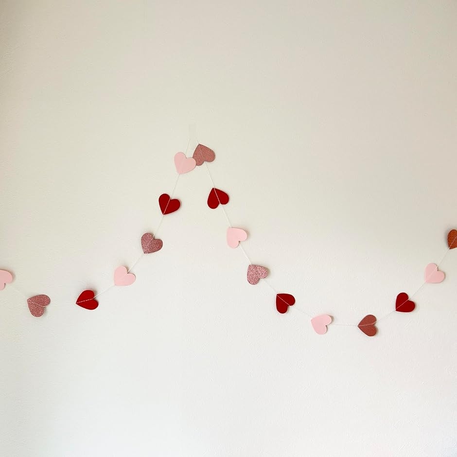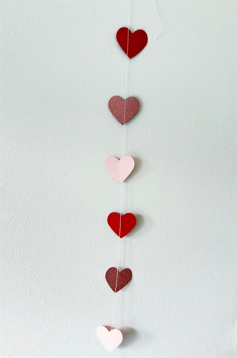 赤・ピンク・ローズゴールドのハートがリズミカルに並ぶ、ロマンチックなガーランド。