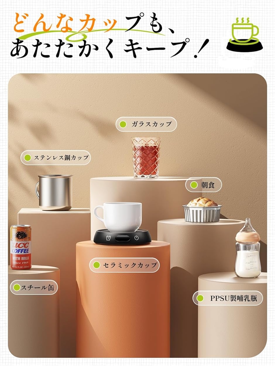 缶コーヒー・陶器カップ・ステンレスマグ・味噌汁椀・哺乳瓶など、あらゆる容器に対応。仕事中のホットドリンクはもちろん、食事中のスープや就寝前のミルクまで、これ一台で冬の毎日を快適に温めます。
