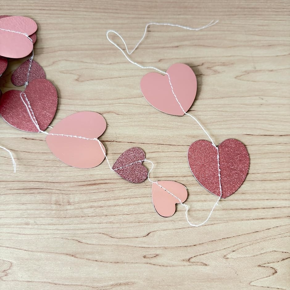 上品な輝きを放つローズゴールドのハート型ガーランドで、特別な空間を演出しませんか? 光沢とラメの異なる質感をミックスした大小のハートが連なる全長約4mのデコレーション。