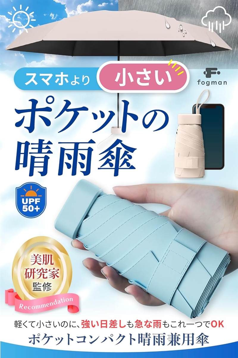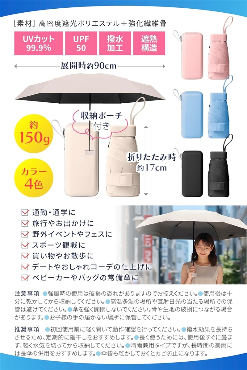 「商品仕様」 素材:高密度遮光ポリエステル+強化繊維骨/サイズ:折りたたみ時約17cm、展開時約90cm/重量:約150g/カラー:全4色(ベージュ・ピンク・ブラック・ブルー)/機能:UVカット99.9%・UPF50+・撥水加工・遮熱構造/セット内容:収納ポーチ付き