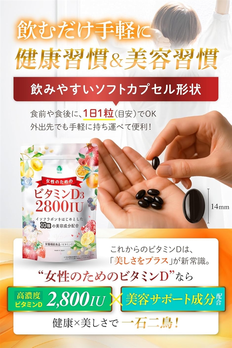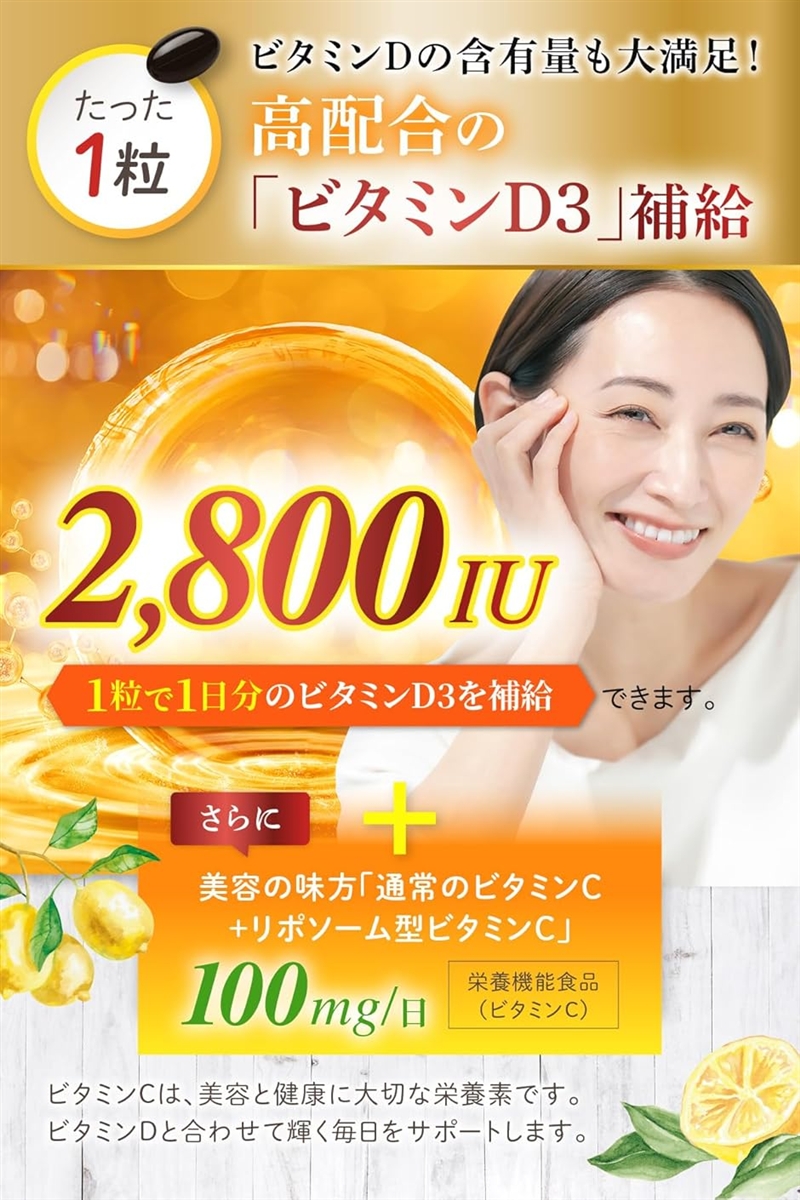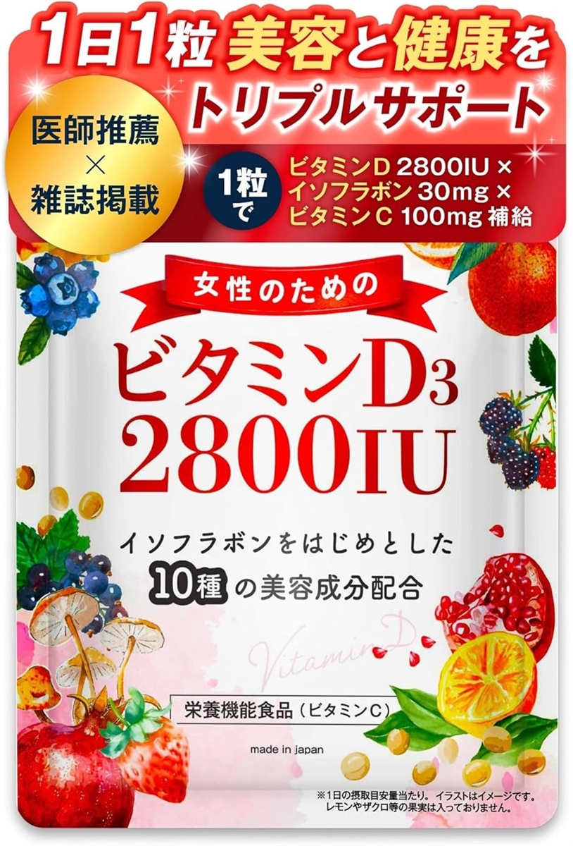 | 商品名 | 現役医師推薦女性のための ビタミンD 2800IU サプリ ビタミンD3 イソフラボンなど10種の美容成分配合x栄養機能食品 ビタミンC |