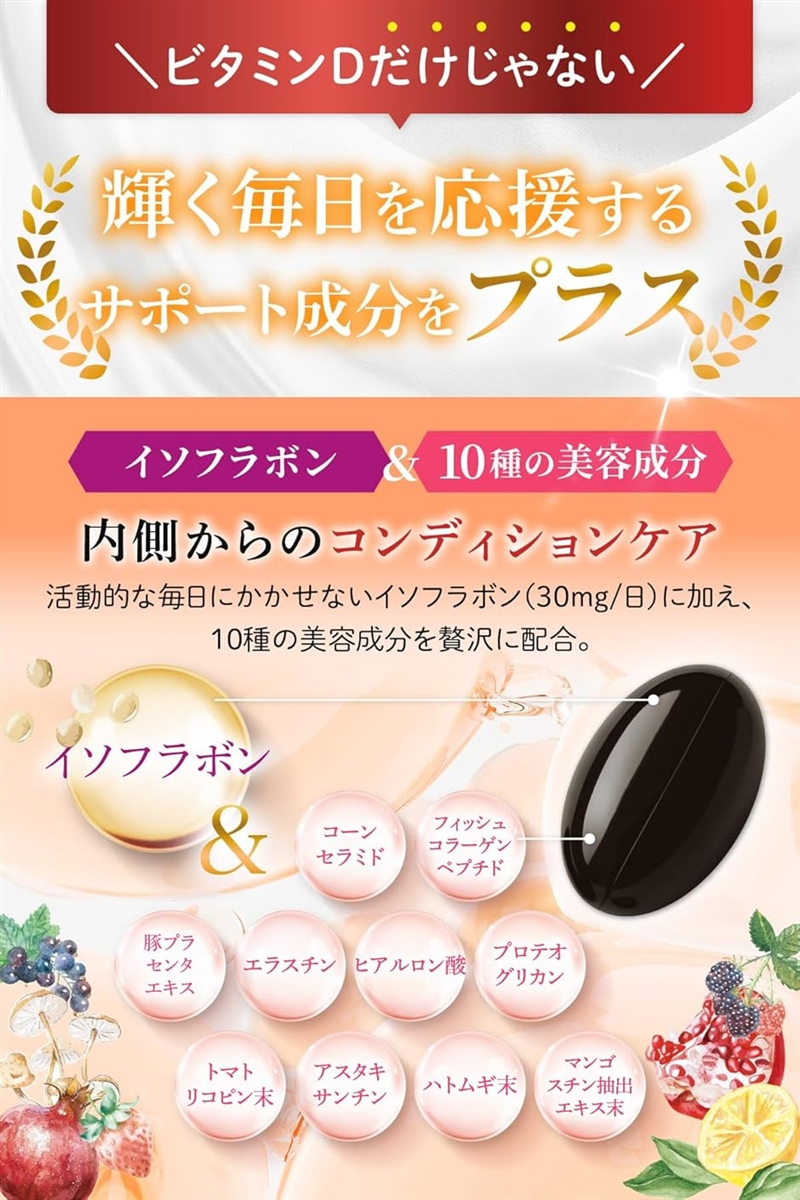 ビタミンD3にビタミンCとイソフラボンおよび10種の美容成分を配合した新発想のサプリです。