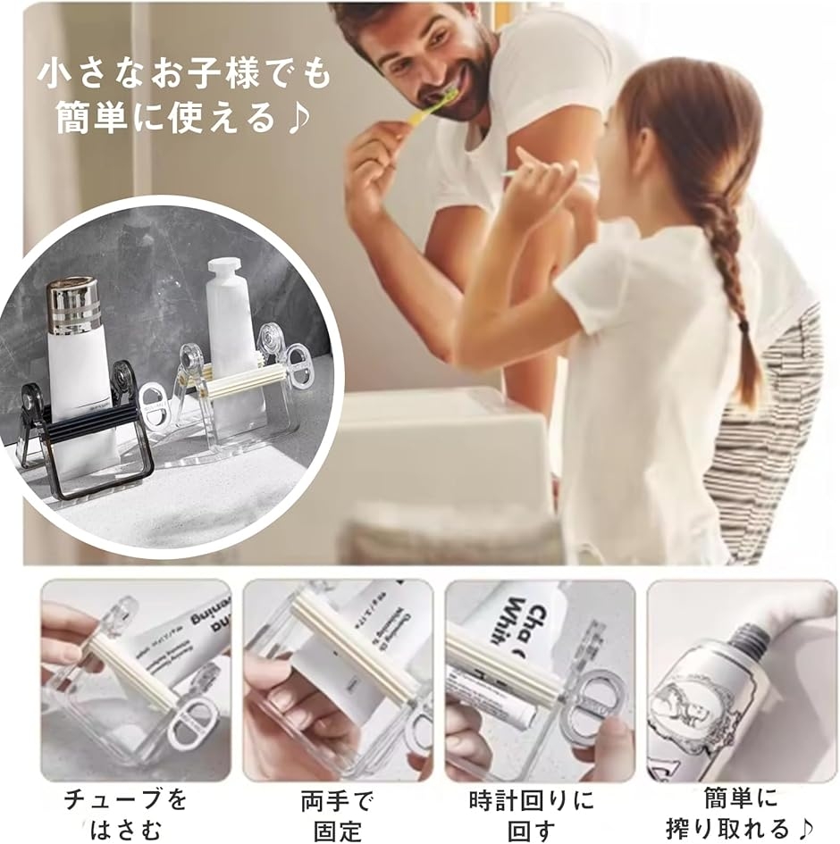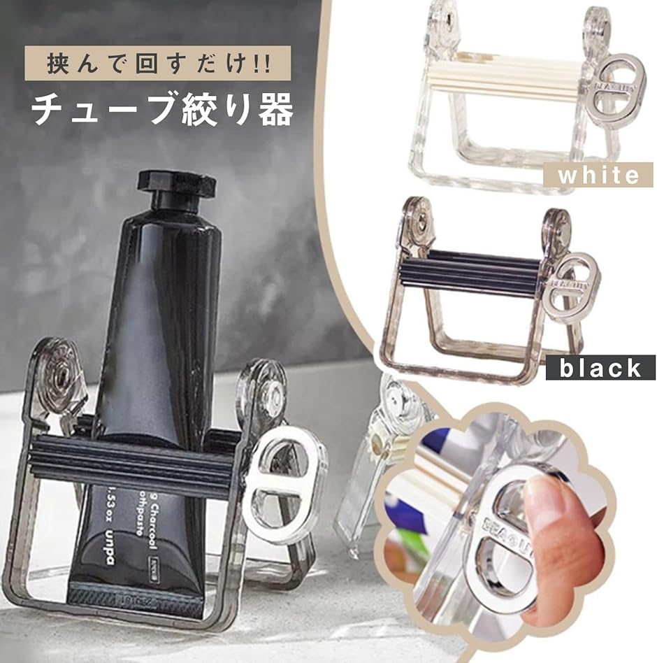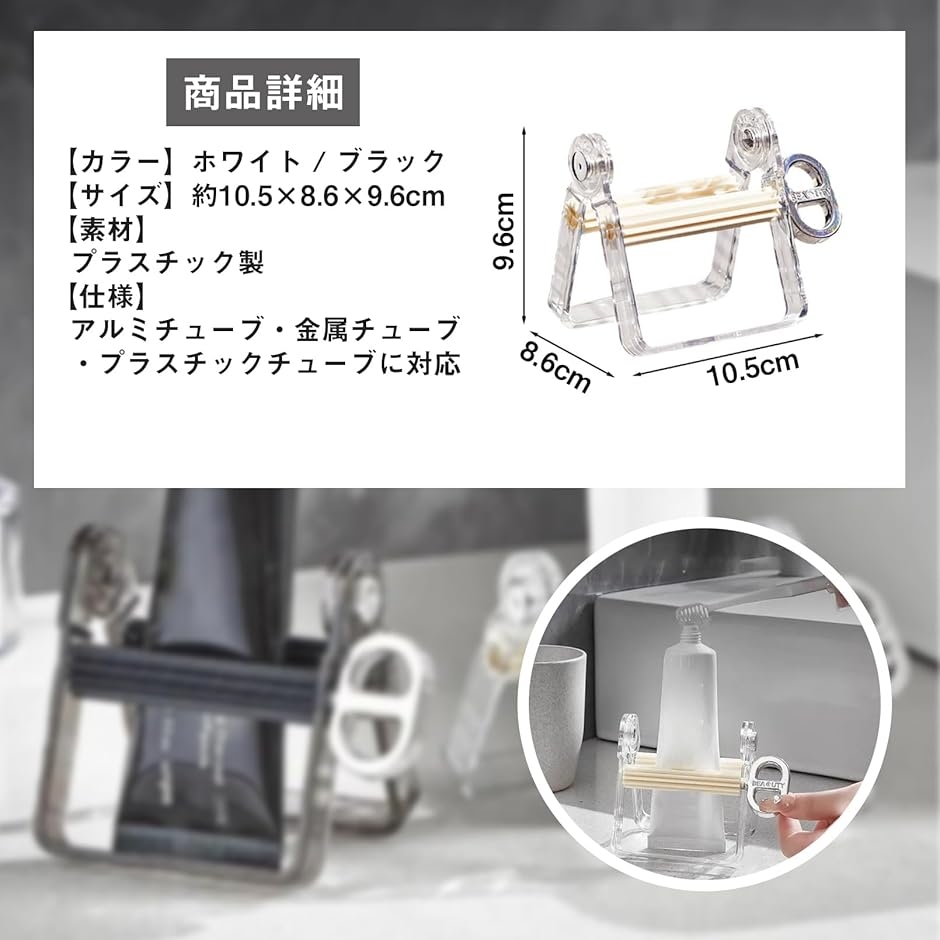 「セット内容」チューブ絞り器 「カラー」ホワイト/ブラック 「サイズ」約10.5x8.6x9.6cm 「素材」プラスチック製 「仕様」アルミチューブ・金属チューブ・プラスチックチューブに対応 *過度に力を加えるとチューブや本体が変形・破損する恐れがあります。