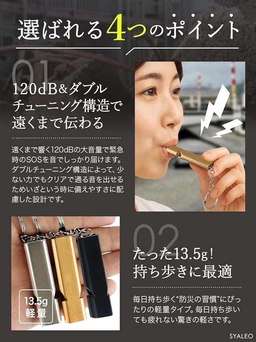 「商品詳細」〇サイズ:縦/5.6cm、横/1.5cm、厚さ/0.8cm 〇重量:13.5g 〇音量:120dB 〇カラー:ブラック、ゴールド、シルバー 〇セット内容:ホイッスル本体x5本(同色) 〇ブランド:SYALEO