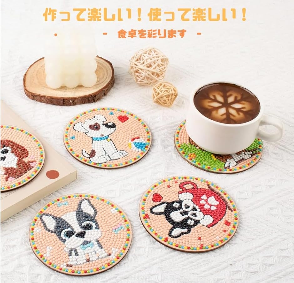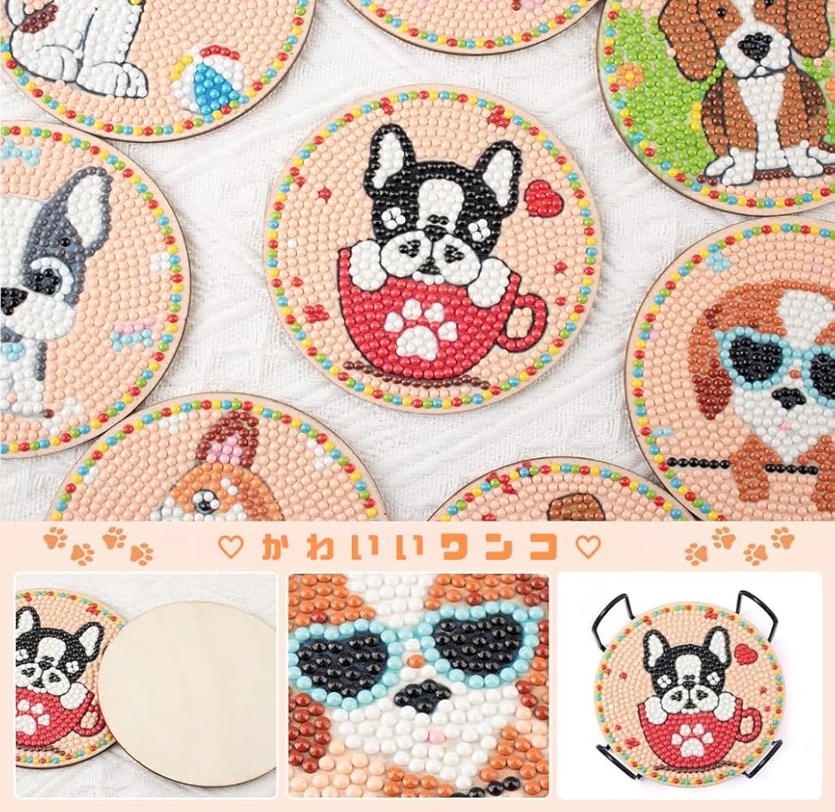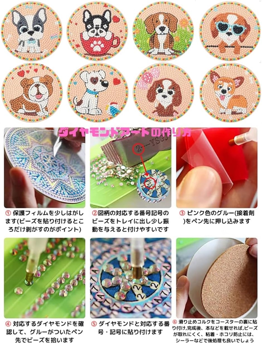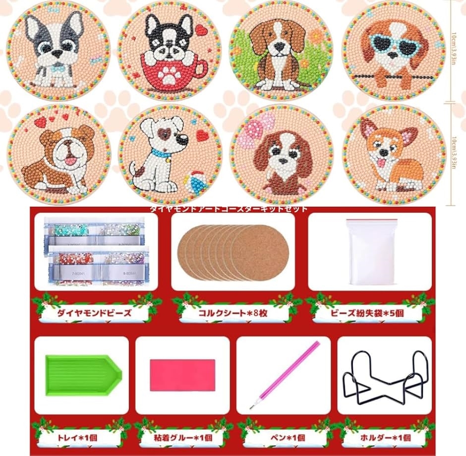 「ダイヤモンドアートコースターセットパッケージ内容」 *犬ワンコ ダイヤモンドアートコースター:8枚 *コルクマット:8枚 *コースターホルダー:1台 *カラフルなダイヤモンド:1セット*ビーズトレイ:1個、ダイヤモンドペン:1本 *グルー:1個*チャック付ビニール小袋:5枚 *日本語取扱説明書付