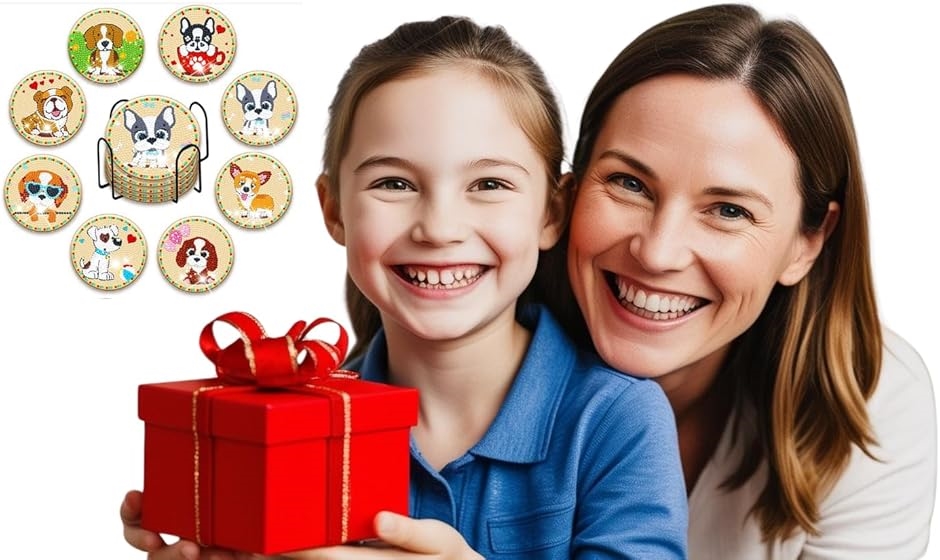 「大切な人に手作りを贈ろう。 ダイヤモンドペイントコースターはギフトにも最適」 美しい輝きと温かさを兼ね備えた、手作りのダイヤモンドペイントコースター。
