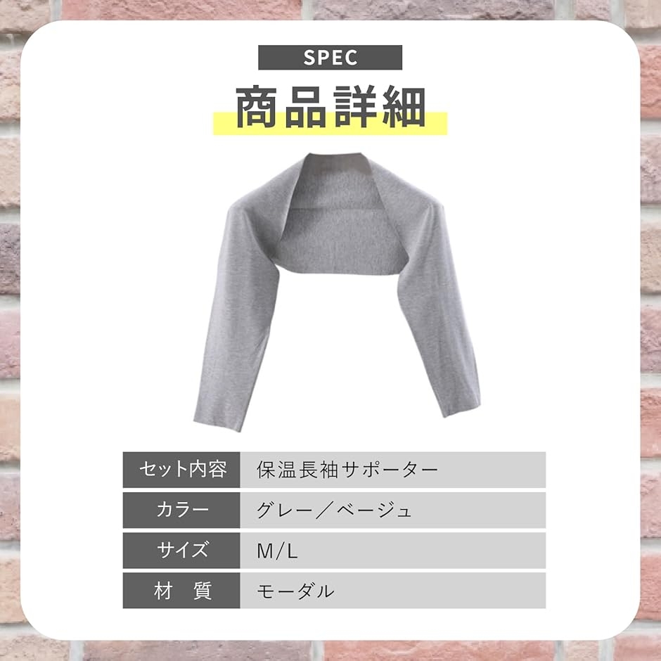 「商品詳細」セット内容:保温長袖サポーター カラー:グレー/ベージュ サイズ:M/L 材質:モーダル *モニターの環境により、色の見え方に若干差が生じる場合がございます。