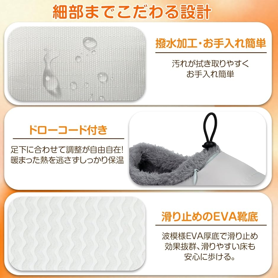 「独自開発の透湿防水防寒素材&滑り止め」脱ぎ履きしやすい電熱スリッパはローカット丈の設計を採用しており、表面は独自開発の透湿防水防寒素材が使われて、生活防水仕様だから、家事をする時またキッチンでも濡れる心配がありません。
