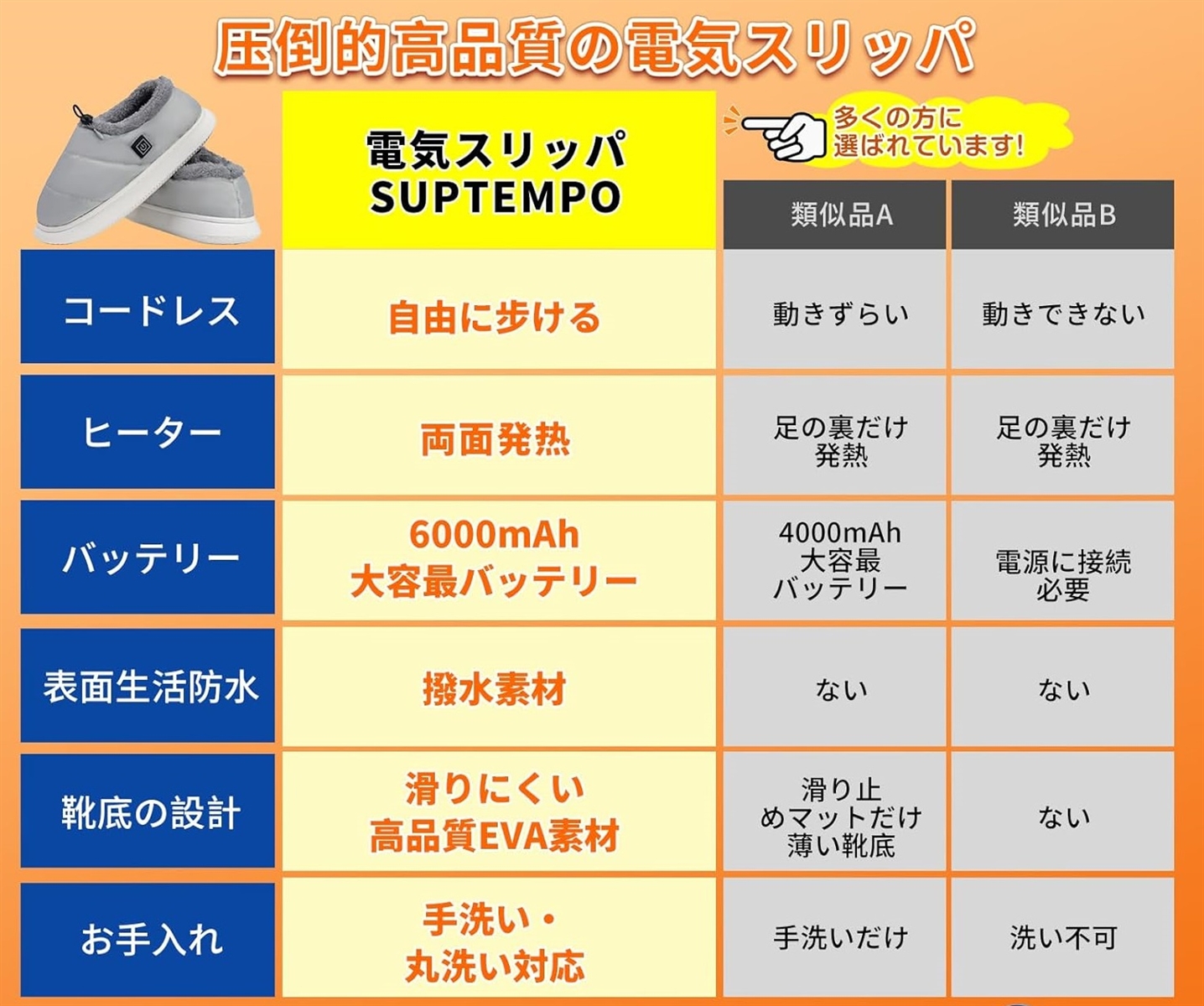 「最新モデル。コードレスで自由に動ける電気スリッパ」フットウォーマーはバッテリーを本体にすっきり収納できる設計で、コードの煩わしさから解放れ、まるで普通のスリッパのように自由に歩き回れます。