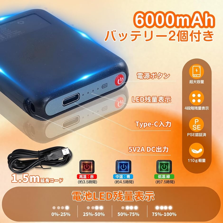 「PSE認証取得・6000mAh大容量バッテリー&2WAY電源対応。」2025新版電気スリッパはDC 5V/2.1A安定出力の6000mAhバッテリーが2個付属しており、高温モードで約3.5時間、中温モードで約5時間、低温モードで約7.5時間の連続使用が可能で、こまめな充電を気にせず、一日中ぽかぽか快適に過ごせます。