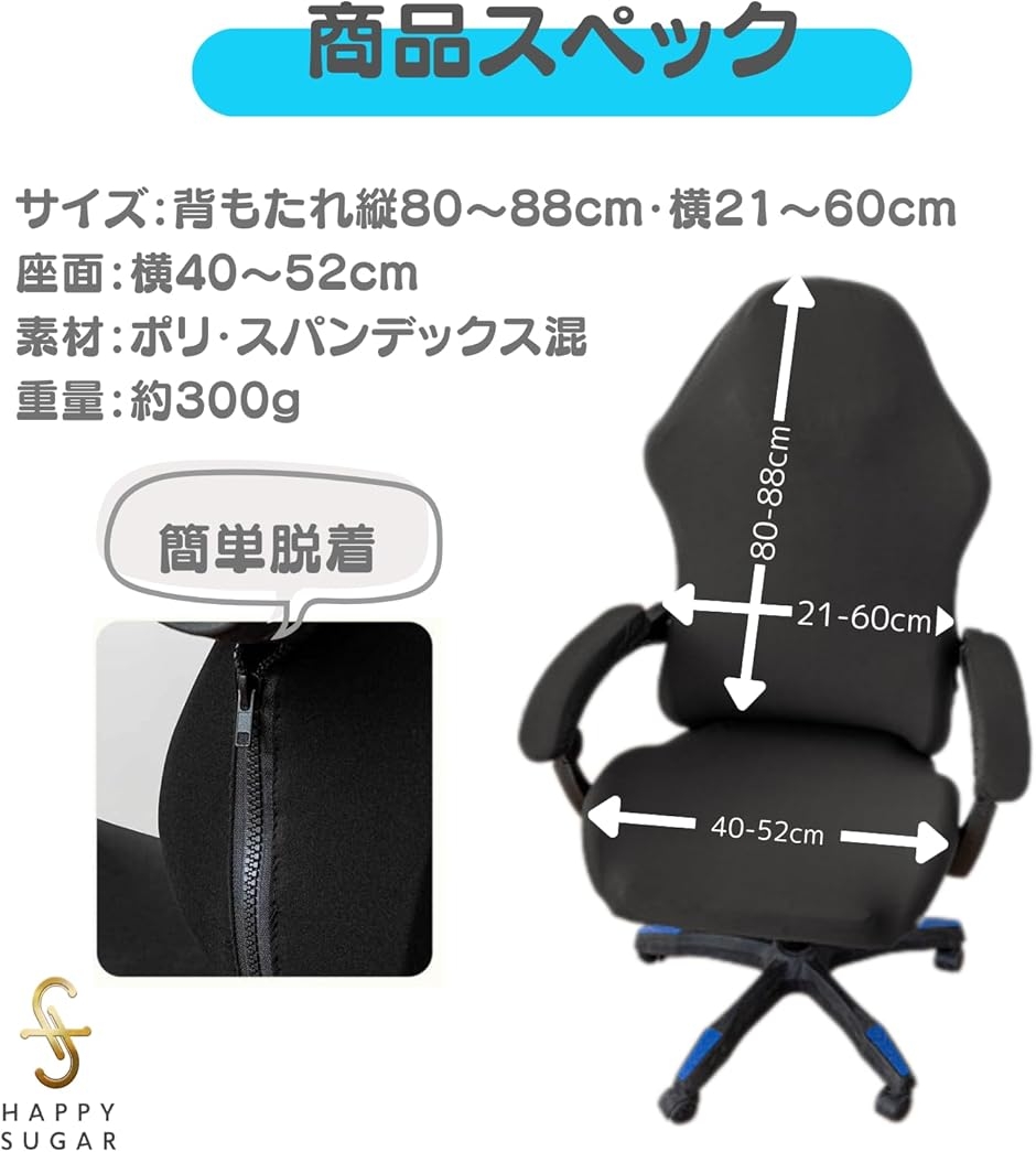 | 商品名 | HAPPYSUGAR ゲーミングチェア カバー 洗える 伸縮素材 アームレスト対応 リクライニング用 4点セット |