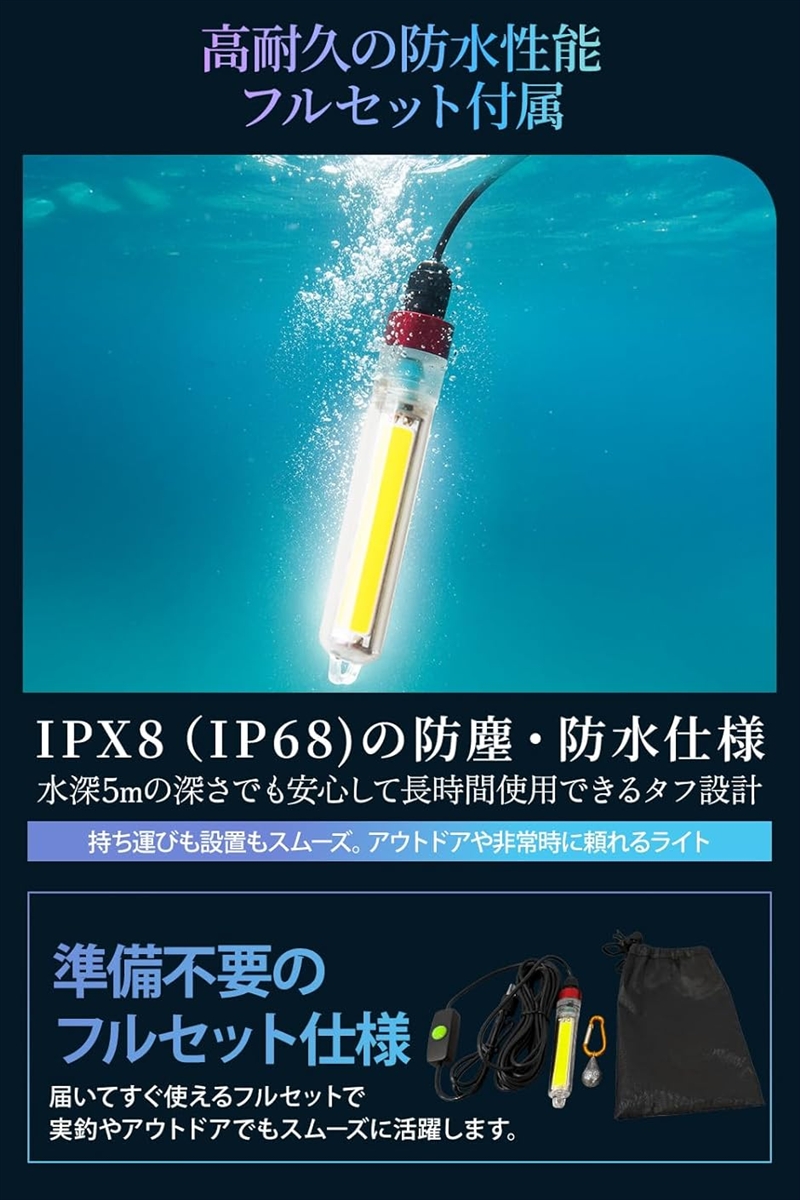 「高耐久の防水性能&フルセット付属」IPX8(IP68)の防塵・防水仕様により、砂埃の舞う堤防や水深5mの深さでも安心して長時間使用できるタフ設計です。