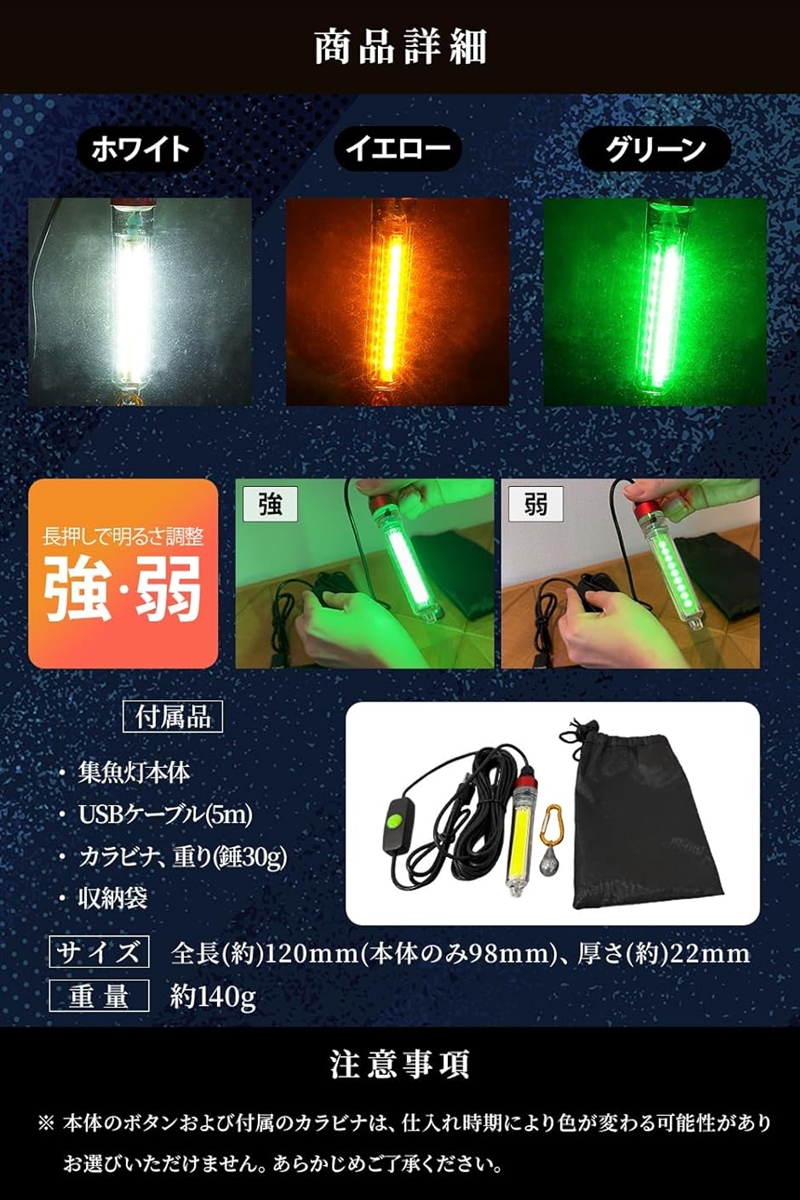 「仕様」サイズ:全長(約)120mm(本体のみ98mm)、厚さ(約)22mm、重量:約140g / カラー:グリーン(緑)、イエロー(黄)、ホワイト(白) / 給電:USB / ライト: 高輝度LED(COB)弱強2段階式 / 付属品:集魚灯本体、USBケーブル(5m)、カラビナ、重り(錘30g)、収納袋 *カラビナの色はお選びいただけません。