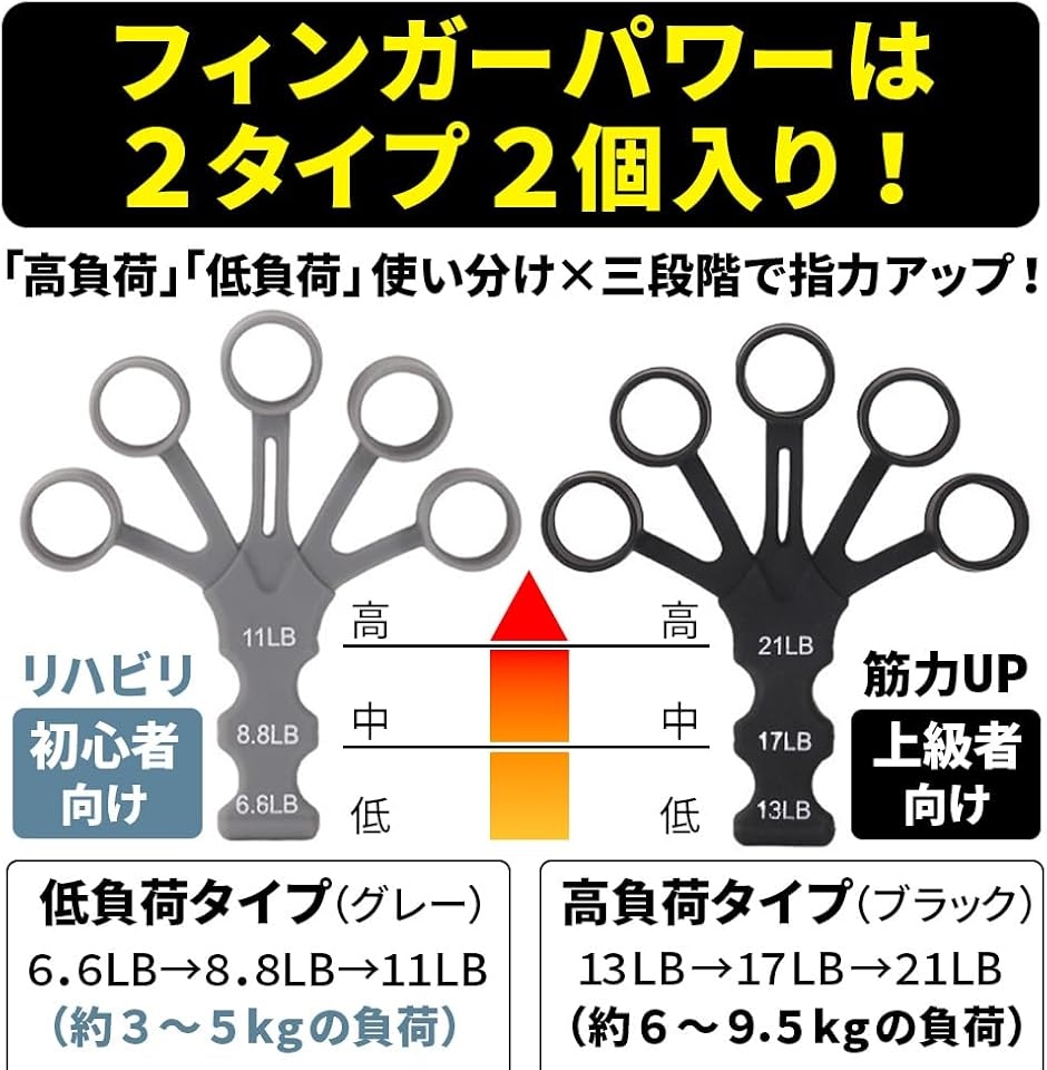 「目的・レベル別に選べる2タイプのフィンガーパワー」指を広げる動作を鍛える「フィンガーパワー」は、低負荷(約3〜5kg)と高負荷(約6〜9.5kg)の2種類入り。