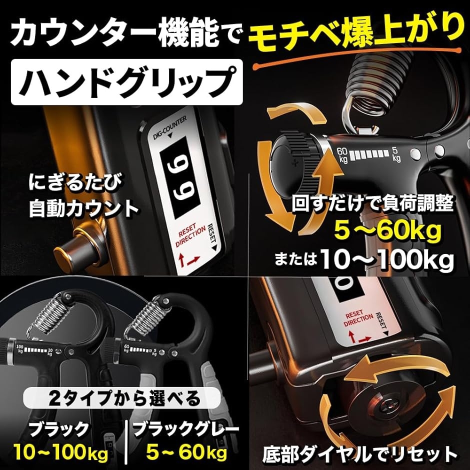 「ハンドグリップは、負荷調整&カウンター付き」握る力を鍛えるハンドグリップは、ダイヤル式で簡単に負荷調整が可能。