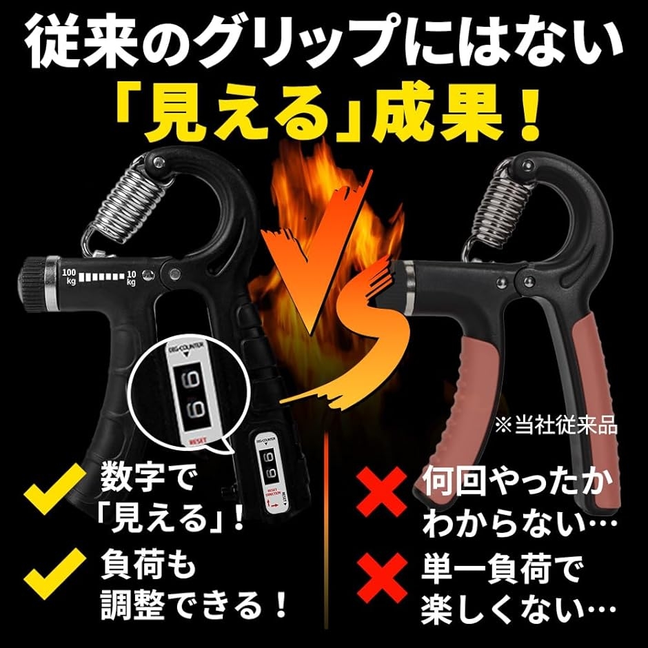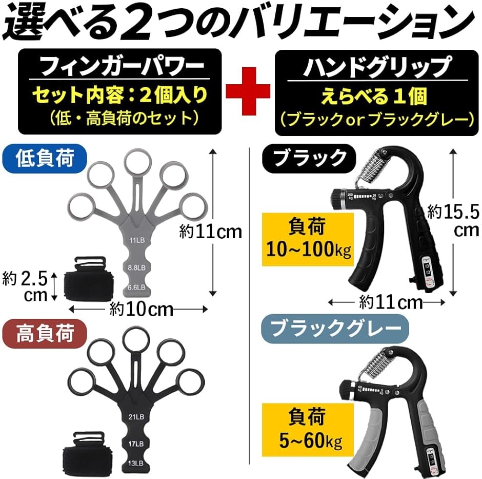 サイズ:約11x10cm(フィンガーパワー)、約15.5x11cm(ハンドグリップ)|重さ:約26g(フィンガーパワー1個あたり)、約150g(ハンドグリップ)|素材:シリコン(フィンガーパワー)、スチール・ABS・TPR(ハンドグリップ)|負荷目安:フィンガーパワー(低負荷:約3〜5kg/高負荷:約6〜9.5kg)、ハンドグリップ(5〜60kg または 10〜100kg)