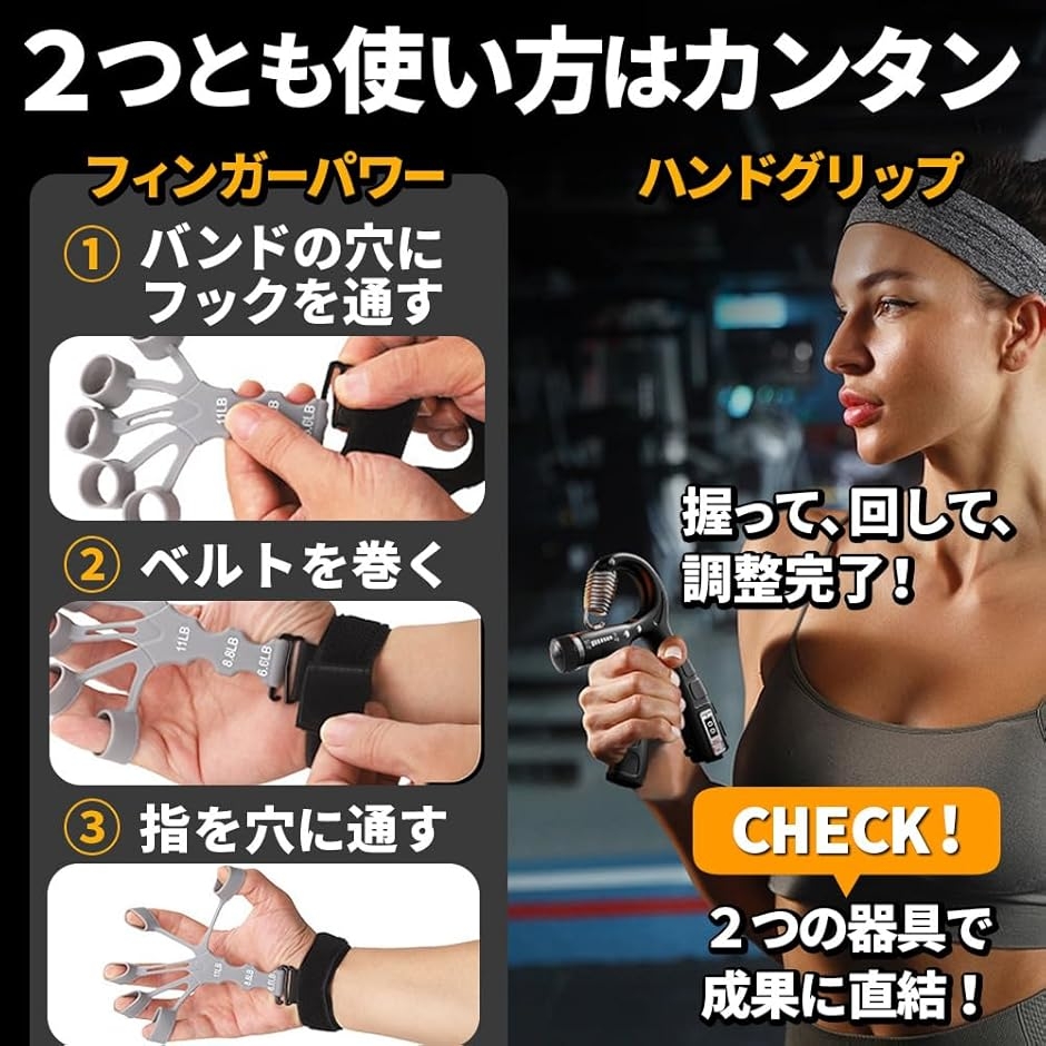 「指力も握力も、1セットでトータル強化。」フィンガーパワーとハンドグリップが1セットになった、指力・握力を総合的に鍛えるトレーニング器具。
