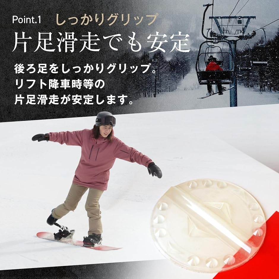 「片足滑走を安定させる強力グリップ」リフト降車やフラット移動時に後ろ足をしっかりグリップ。