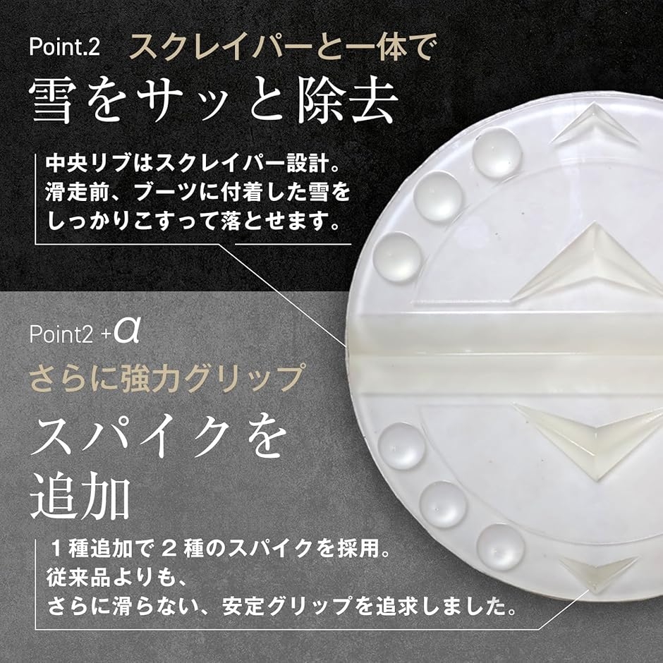 「安定グリップを追求した独自設計」ブーツ底に付いた雪を簡単に落とすスクレーパに加え、2種のスパイクを配置することによりグリップ力を強化しています。
