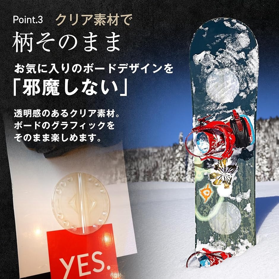 「クリア素材でデザインを邪魔しない」透明感のあるクリア素材を採用し、ボードのグラフィックやロゴを隠さずスタイリッシュに使用可能です。