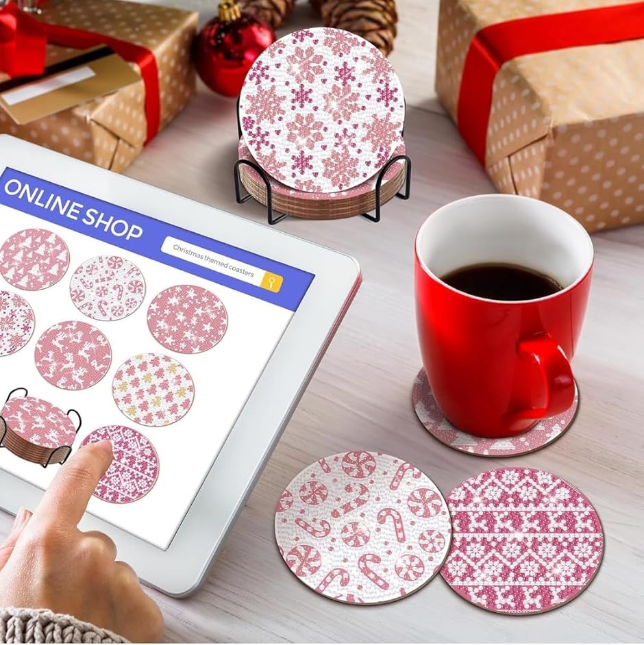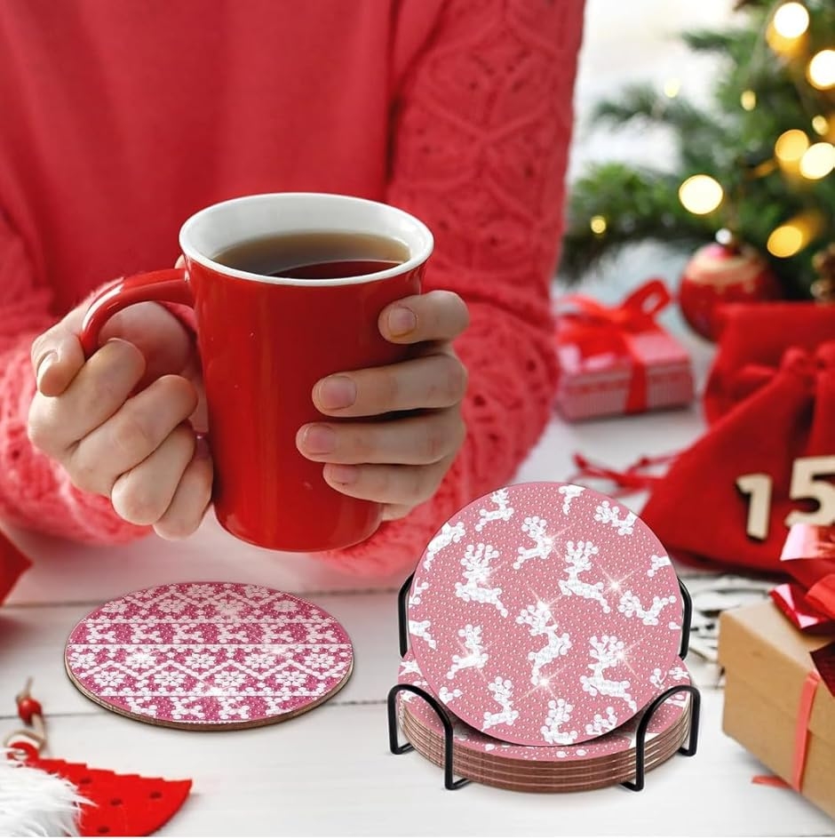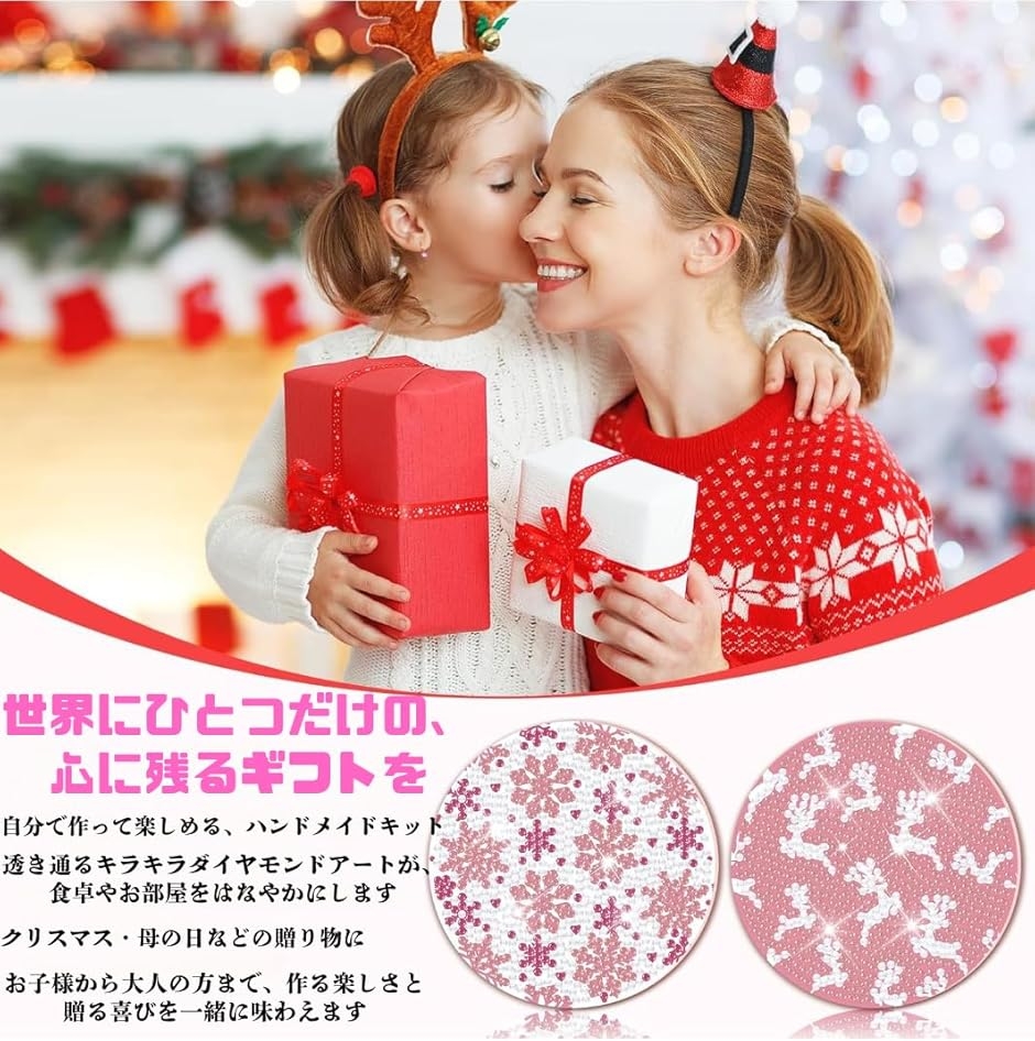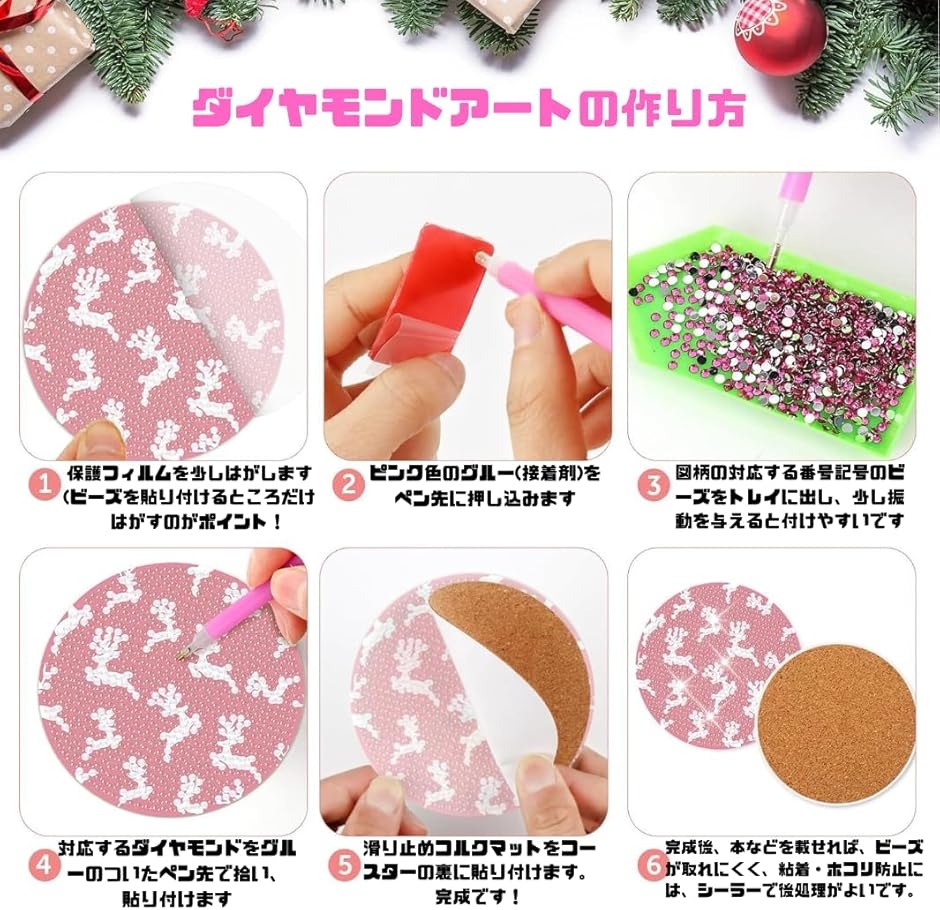 「ダイヤモンドアートコースターセットパッケージ内容」 トナカイ/雪の結晶/クリスマスツリーなど ダイヤモンドアートコースター:8枚 コルクマット:8枚 コースターホルダー:1台 カラフルなダイヤモンド:1セット ビーズトレイ:1個、ダイヤモンドペン:1本 グルー:1個 チャック付ビニール小袋:5枚 日本語取扱説明書付