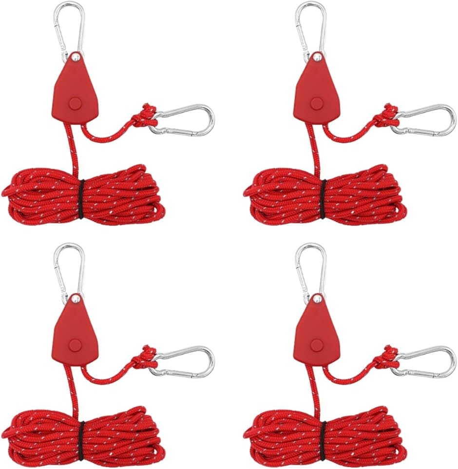 商品仕様 ・内容:ロープラチェットx4個 ・ロープ長:約4m ・ロープ径:約4mm ・耐荷重:約68kg ・カラー:カーキ/グリーン/オレンジ/ブラック/レッド キャンプやバーベキュー、フェス、ピクニック、車中泊、DIYなどあらゆるシーンで役立つ万能ギア。