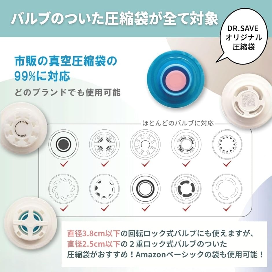 「圧縮袋対応ノズル6種付属」 市場の約99%の圧縮袋に対応。