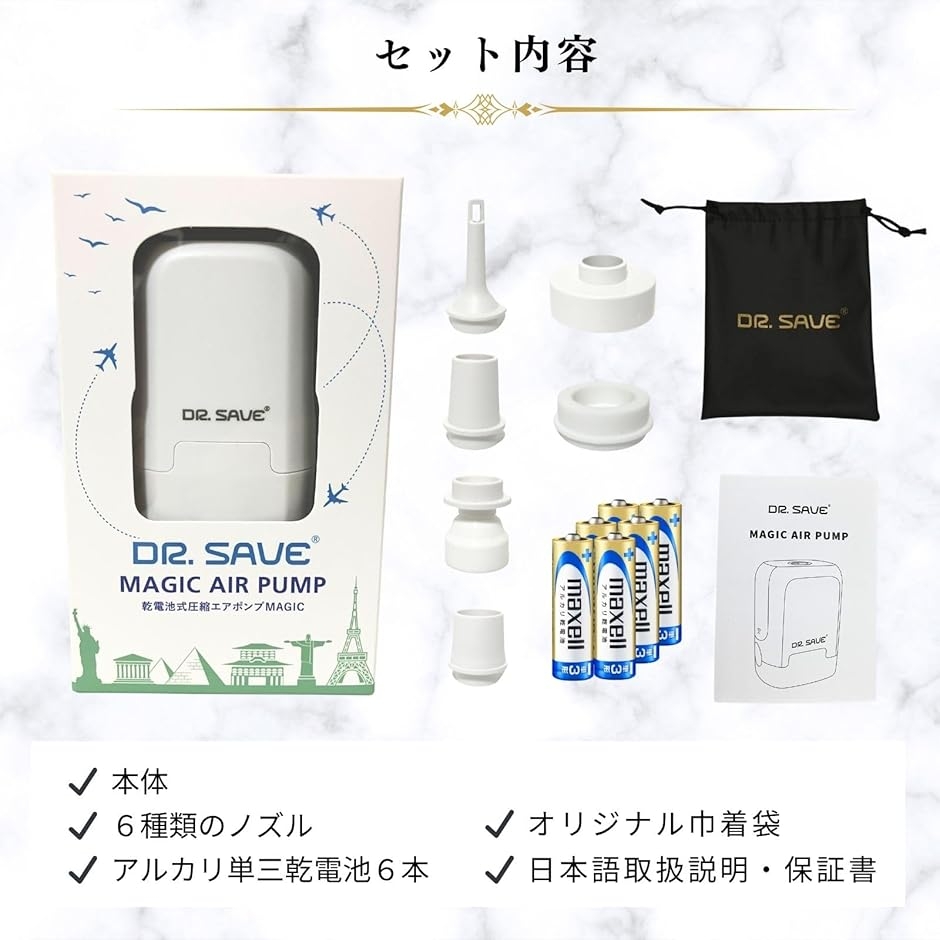 | 商品名 | DR.SAVE 乾電池式圧縮エアポンプ MAGIC 旅行 寝具 アウトドア 2in1で空気抜き・入れ 大風量300L/min アルカリ乾電池6本付属 |