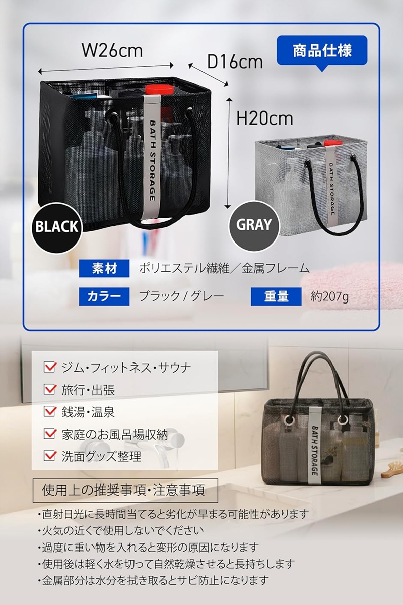 「商品仕様」 素材:ポリエステルメッシュ、金属フレーム、コットンハンドル/サイズ:26x16x20cm/重量:約207g/カラー:グレー・ブラック/用途:サウナ・スパ・温泉・銭湯・ジム・旅行