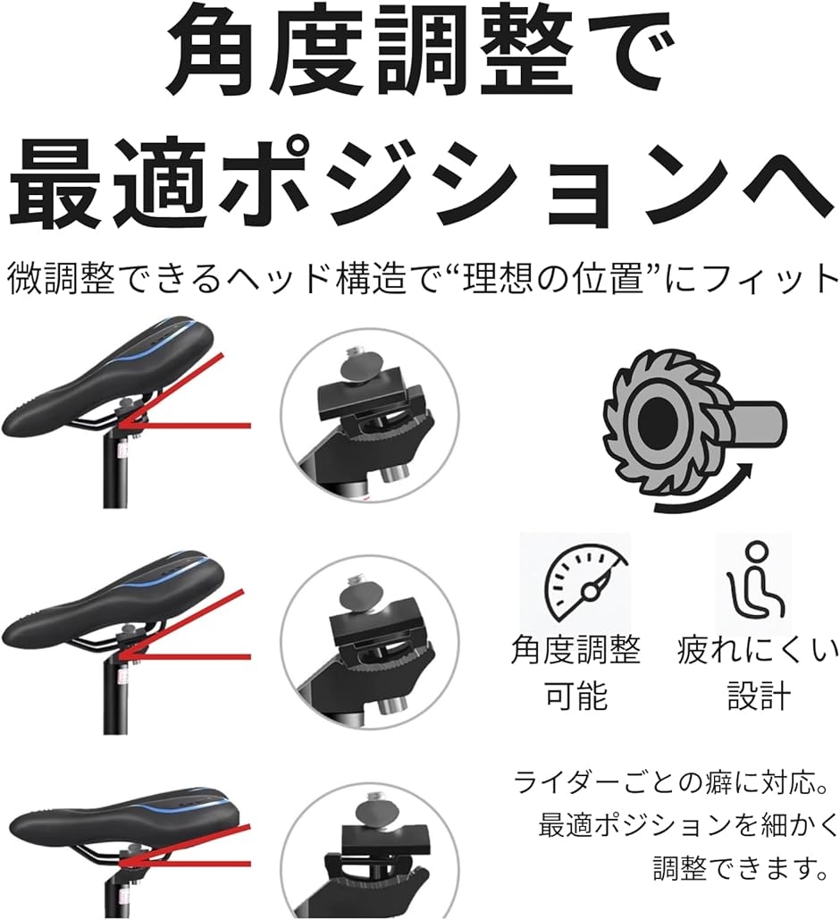 「角度調整でライディングポジションを自在に最適化」 ダブルレール構造のヘッドが微細な角度調整を可能にし、サドルの前後バランスを自分好みにカスタムできます。