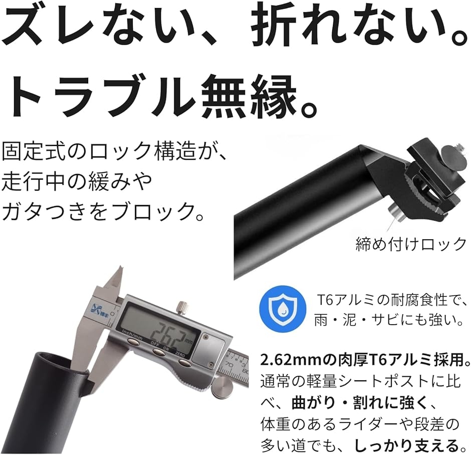 「用途を選ばないシートポスト」 ロード・マウンテン・ミニベロ・エアロバイクなど、幅広い車種に対応。