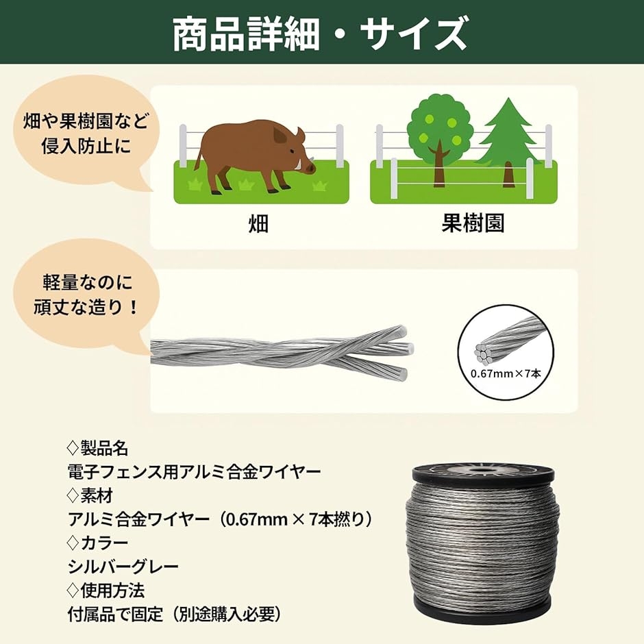 「商品仕様」材質:アルミニウム合金 線径:2.0mm(0.67mm 7股)長さの種類:100m / 200m 構造:撚線タイプ 特徴:高導電・軽量 適用:畑、果樹園、家庭菜園、山林の電気柵用ワイヤーに