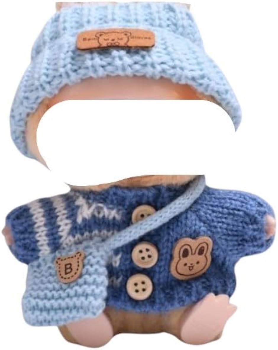 v ラブブ専用のニットコーデセットは、あったかニット帽、ボタン留めデザインのセーター、ハンドメイド感あふれるバッグが揃ったおしゃれアイテム。