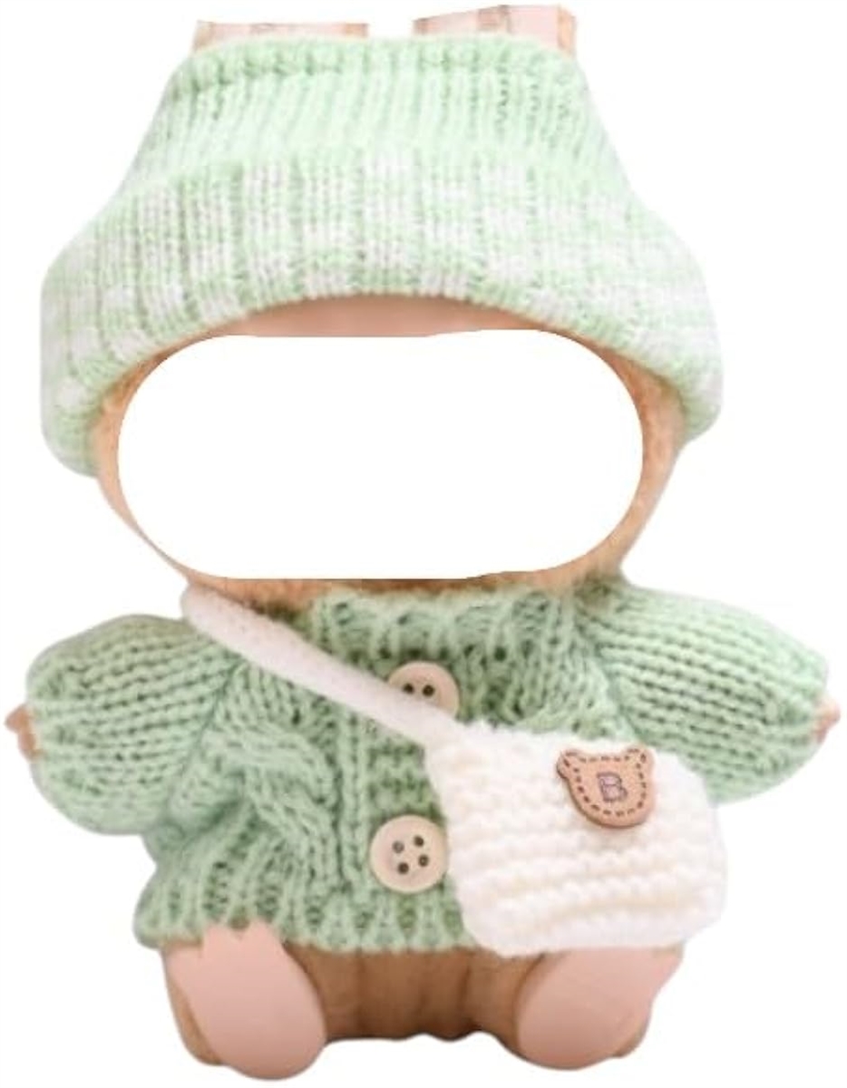 v ラブブ専用のニットコーデセットは、あったかニット帽、ボタン留めデザインのセーター、ハンドメイド感あふれるバッグが揃ったおしゃれアイテム。